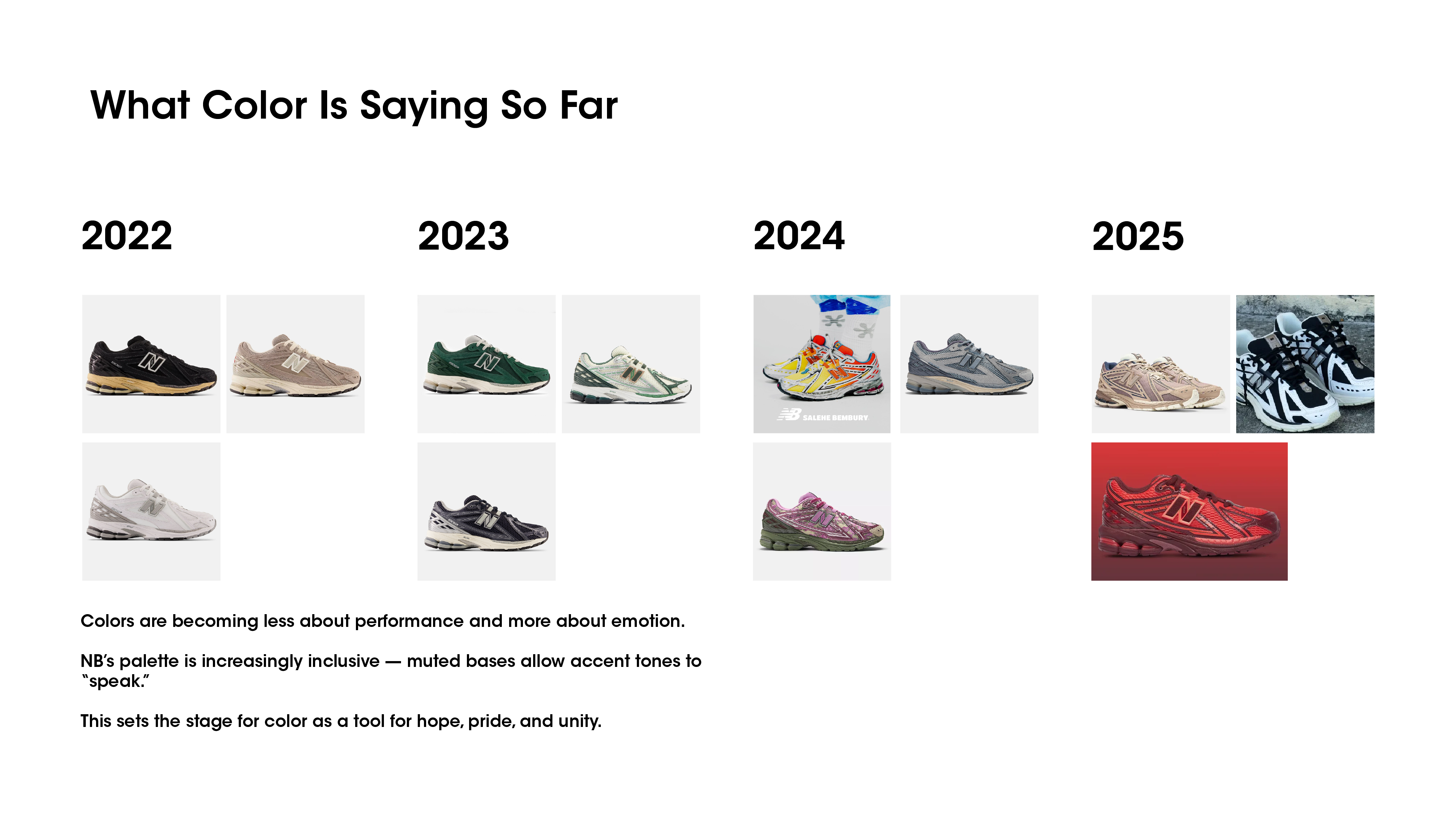 A color strategy for New Balance that redefines balance as social harmony, translating Collective Renewal into colors that channel resilience, optimism, and collective renewal in a divided world.